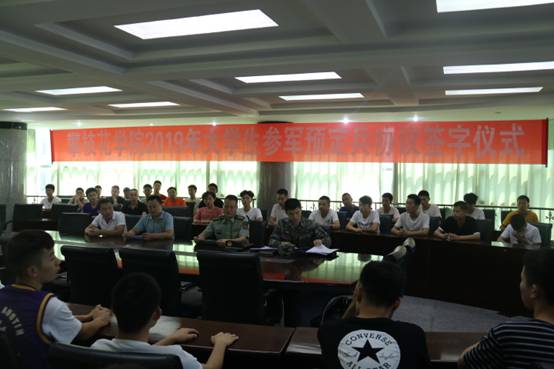 620日下午,2019年大学生参军预定兵签字仪式在办公楼五楼会议室举行。东区人民武装部部长康贺卫、学生工作部部长周传兴,51名预定兵参加了本次签字仪式。