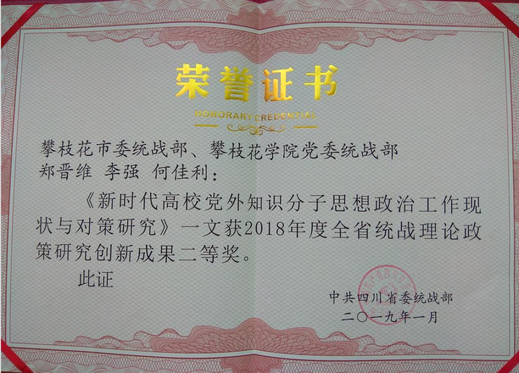 近日,从《关于2018年度全省统战理论政策研究创新成果的通报》〔20193号)中获悉,四川省委统战部对15篇一等奖、30篇二等奖、45篇三等奖论文予以通报。其中,由我校党委统战部和攀枝花市委统战部联合报送的统战理论研究成果《新时代高校党外知识分子思想政治工作现状与对策研究》一文(作者:郑晋维、李强、何佳利)获得2018年度全省统战理论政策研究创新成果二等奖。