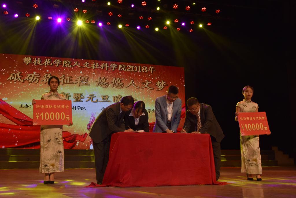晚会现场,人文学院优秀校友广聚律师事务所所长刘陈设立广聚奖学金10万元,用于奖励通过国家法律职业资格考试的法学专业学生,首次颁发45600元,并与将去广聚律师事务所上班的2名应届毕业生现场签订三方协议。