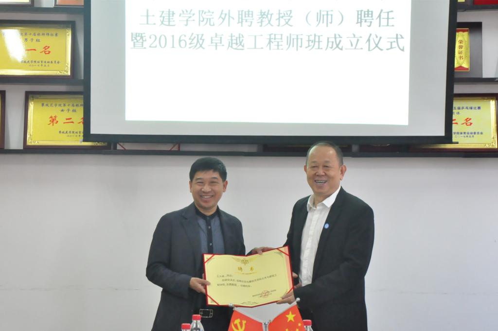 11月12日上午,我校土建学院于砺志楼二楼会议室举行了土建学院外聘教授(师)聘任暨2016级卓越工程师班成立仪式。校党委书记肖立军参加仪式,并为24名建设领域专家学者颁发外聘教授(师)聘书。会议由土建学院党委书记主持。土建学院院领导、各科室负责人,外聘教授(师)、优秀校友、卓越工程师班全体师生参加仪式。