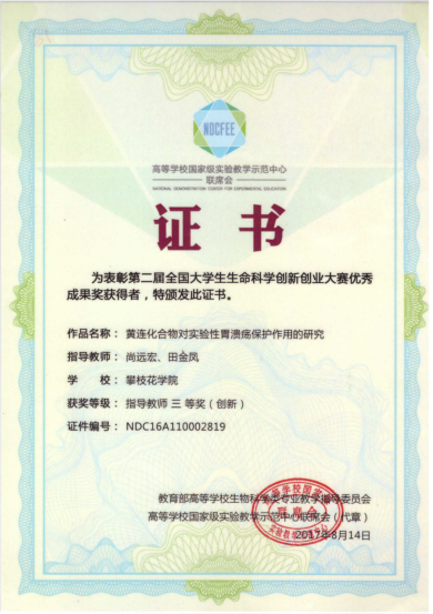 近日,由教育部高等学校生物科学类专业教学指导委员会、国家级实验教学示范中心联席会联合主办的第二届全国大学生生命科学创新创业大赛在兰州大学圆满落幕。我校学子参赛作品“黄连化合物对实验性胃溃疡保护作用的研究”和“攀枝花芒果冻干生产销售” 喜获三等奖。